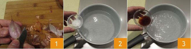 Um den Krautsalat mit Schalotten zuzubereiten, beginnen Sie damit, die Schalotten zu schälen 1, erhitzen Sie dann in einem Topf das Wasser mit einer Prise grobem Salz 2 und dem Rotweinessig 3.