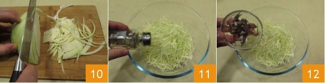 Schneiden Sie den Kohl in dünne Streifen 10. Geben Sie den Kohl in eine Schüssel und würzen Sie mit wenig Salz (Sie können es auch weglassen, da die Sardellen schon würzig sind, wenn Sie einen nicht zu intensiven Geschmack bevorzugen), Pfeffer 11, dann fügen Sie die gereinigten Sardellenfilets hinzu 12