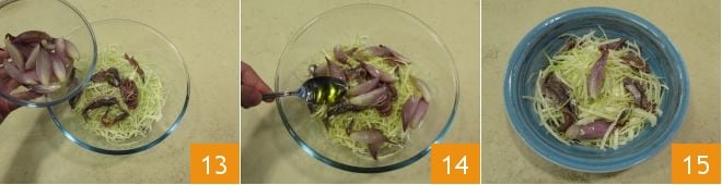 Fügen Sie auch die Schalottenspalten hinzu 13 und würzen Sie mit Olivenöl 14. Ihr Krautsalat mit Schalotten ist bereit, auf den Tisch gebracht zu werden 15.