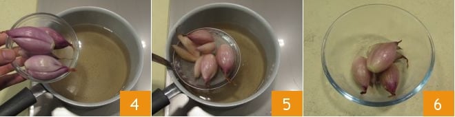 Fügen Sie die Schalotten hinzu 4 und kochen Sie sie 5 Minuten. Dann schöpfen Sie die Schalotten mit einem Schaumlöffel ab 5 und geben Sie sie in eine kleine Schüssel 6.