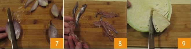 Leicht abkühlen lassen, dann die Schalotten in Spalten schneiden 7; kümmern Sie sich dann um die gesalzenen Sardellen: kratzen Sie das überschüssige Salz mit einem Messer ab, dann schneiden Sie sie der Länge nach in zwei Hälften und entfernen Sie die Mittelgräte 8, spülen Sie die Sardellenfilets unter fließendem Wasser ab. Nehmen Sie den Kohl: wir haben Weißkohl verwendet, aber Sie können auch Wirsing verwenden, wenn Sie möchten; schneiden Sie ihn in der Mitte durch und entfernen Sie den Strunk, der der härteste Teil ist 9.