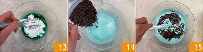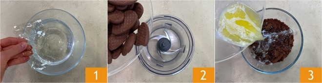 Um den Bröselkuchen ohne Backen mit Minze und Schokolade zuzubereiten, legen Sie zuerst die Gelatineblätter in kaltes Wasser ein 1. Währenddessen schmelzen Sie die Butter in einem kleinen Topf und lassen Sie abkühlen. Geben Sie die Kekse in den Mixer 2 und zerkleinern Sie sie, bis Sie eine körnige Masse erhalten. Alles in eine Schüssel geben und die geschmolzene Butter hinzufügen 3.