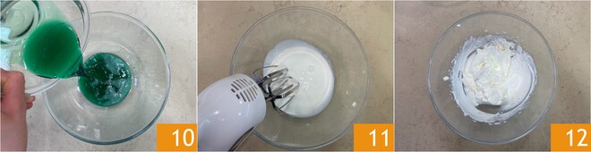 Den restlichen Sirup bei Zimmertemperatur hinzufügen 10, mischen und abkühlen lassen. In der Zwischenzeit die Sahne schlagen 11 12.
