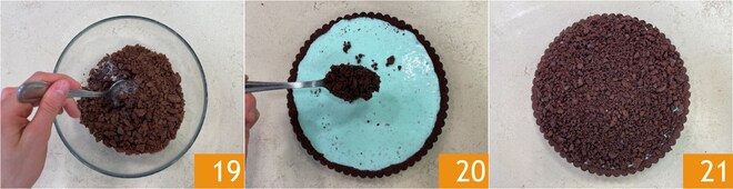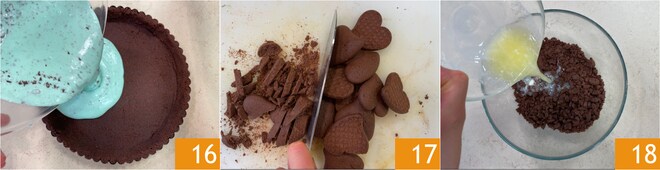 Den Boden aus dem Kühlschrank nehmen und die Füllung in die Springform gießen 16, dann wieder in den Kühlschrank stellen. In der Zwischenzeit die Abdeckung vorbereiten: Die Butter in einem kleinen Topf schmelzen, die Kekse im Mixer zerkleinern 17 und beide in eine Schüssel geben 18.