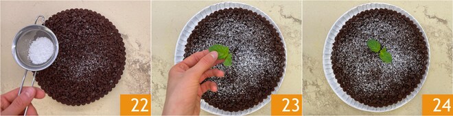 Lösen Sie den Kuchen auf einer Servierplatte und garnieren Sie mit Puderzucker 22 und Minzblättern 23. Ihr Bröselkuchen ohne Backen mit Minze und Schokolade ist bereit, genossen zu werden 24!