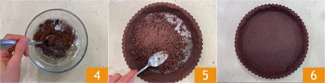 Gut mischen 4. Zwei Drittel der Mischung in eine Springform mit einem Durchmesser von 22 cm geben. Mit dieser Menge den Rand formen 5, dann den Rest für den Boden hinzufügen 6. Im Kühlschrank 10-15 Minuten fest werden lassen.