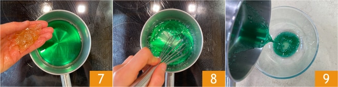 In der Zwischenzeit die Füllung vorbereiten: Entnehmen Sie 60 g vom gesamten Minzsirup und erhitzen Sie es in einem kleinen Topf, fügen Sie dann die gut ausgedrückten Gelatineblätter hinzu 7. Mischen und vollständig auflösen 8. Den Sirup in eine Schüssel gießen 9.