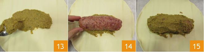 Rollen Sie den Blätterteig auf einer Arbeitsfläche aus, verteilen Sie ein paar Esslöffel Linsencreme in der Mitte 13, legen Sie das Cotechino in die Mitte 14 und bedecken Sie es vollständig mit dem Rest der Creme 15.