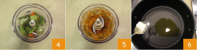 Geben Sie die Karotte, den Sellerie, die Zwiebel und den Rosmarin in die Schüssel des Mixers (alternativ können Sie den Rosmarin auch ganz in der Pfanne hinzufügen) 4. Zerkleinern Sie alles fein mit ein paar Umdrehungen der Messerklingen 5. Jetzt erhitzen Sie das Öl und die Butter in einer Pfanne 6.