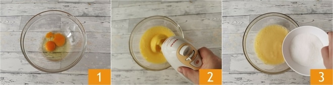 Um den Kuchen mit Schokostückchen zuzubereiten, gebt als erstes die Eier in eine Schüssel 1. Beginnt, sie mit einem elektrischen Mixer zu schlagen 2, und wenn sie schaumig sind, fügt den Zucker hinzu 3.
