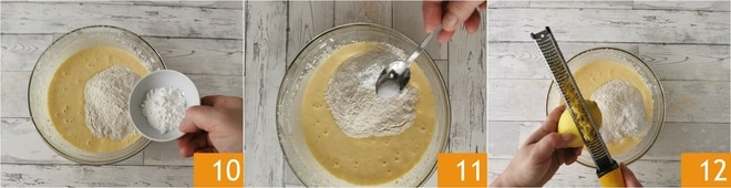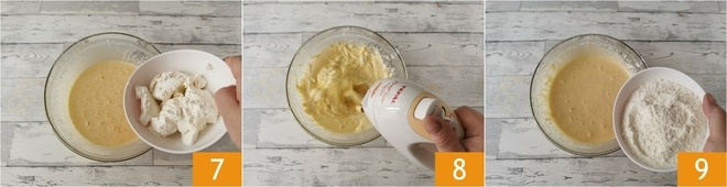 Fügt auch den Ricotta hinzu 7 und arbeitet ihn mit dem elektrischen Mixer ein 8. An diesem Punkt gebt das Mehl auf einmal hinzu 9,