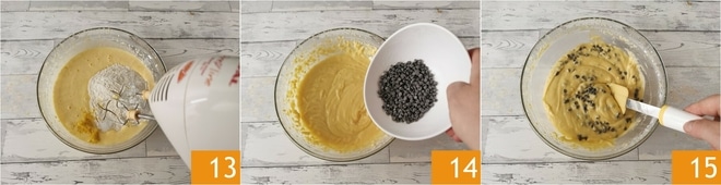 Mischt mit dem Mixer, um alle Zutaten zu verbinden 13, bis ihr eine glatte und dichte Masse erhaltet 14. Gebt die Hälfte der Schokostückchen 14 hinzu und mischt sie mit einem Spatel unter 15.