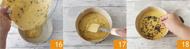 Gießt dann den Teig in eine 20 cm Form, die zuvor mit Backpapier ausgelegt wurde 16. Glättet die Oberfläche 17 und verteilt die restlichen Schokostückchen darauf 18.