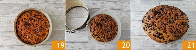 Backt im vorgeheizten statischen Ofen bei 180° für 40 Minuten. Macht die Stäbchenprobe, bevor ihr den Kuchen aus dem Ofen nehmt 19. Lasst ihn abkühlen, dann nehmt den Kuchen aus der Form 20 und serviert ihn 21.