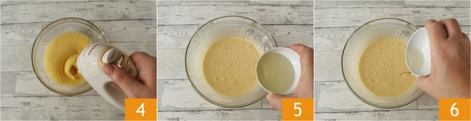 Fahrt fort, mit dem elektrischen Mixer zu schlagen 4, bis ihr eine stabile Masse erhaltet. Gebt dann das Öl in einem Schwung hinzu 5 6.