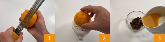 Um den Kuchen mit Trockenfrüchten und Karamell zuzubereiten, reiben Sie zuerst die Schale einer Orange ab 1 und pressen dann den Saft aus 2. Geben Sie die Rosinen in eine kleine Schüssel und fügen Sie den Orangensaft hinzu 3. Lassen Sie sie bis zur Verwendung einweichen.