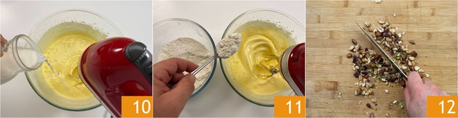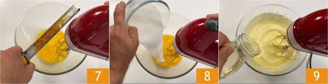 In einer Schüssel schlagen Sie die Eier auf, fügen die zuvor abgeriebene Orangenschale hinzu 7 und beginnen mit einem elektrischen Mixer zu arbeiten. Diese Schritte können auch mit einer Küchenmaschine durchgeführt werden. Fügen Sie den Zucker hinzu 8 und schlagen Sie 10-15 Minuten lang. Wenn die Mischung gut aufgegangen ist, reduzieren Sie die Geschwindigkeit des Mixers und gießen Sie das Pflanzenöl langsam ein 9.