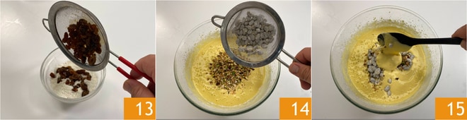 Holen Sie die Rosinen heraus und mehlen Sie sie leicht 13. Fügen Sie die Trockenfrüchte und die Rosinen dem Teig hinzu 14. Rühren Sie von unten nach oben, um den Teig nicht zu entlüften 15.