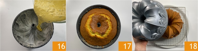 Gießen Sie den Teig in eine 24 cm Durchmesser Form 16, die zuvor gefettet und bemehlt wurde. Backen Sie ihn im vorgeheizten statischen Ofen bei 180°C für 50-60 Minuten 17. Lassen Sie ihn abkühlen und stürzen ihn dann auf ein Gitter 18.