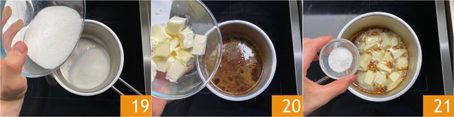 Jetzt widmen Sie sich der Zubereitung des Karamells. Geben Sie den Zucker in einen kleinen Topf 19 und erhitzen Sie ihn bei mittlerer Hitze. Wenn er sich aufgelöst hat und die typische Karamellfarbe erreicht hat, fügen Sie die Butter 20, das Salz 21 hinzu und rühren um.