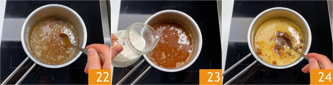 Sobald die Butter geschmolzen ist 22, reduzieren Sie die Hitze, fügen Sie die warme Sahne hinzu 23 und rühren Sie vorsichtig um 24. Schalten Sie die Hitze aus und geben Sie das Karamell in eine schüssel, die für hohe Temperaturen geeignet ist.