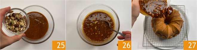 Fügen Sie die zerkleinerten Trockenfrüchte zum Karamell hinzu 25, rühren Sie um 26 und lassen es auf Zimmertemperatur abkühlen. Gießen Sie es über den Kuchen 27. Ihr Kuchen mit Trockenfrüchten und Karamell ist bereit zum Genießen.