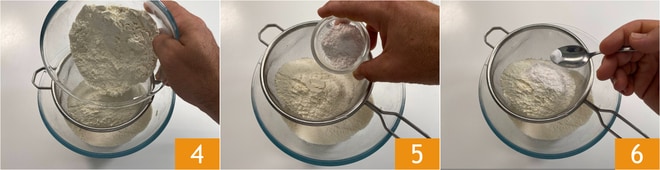 Sieben Sie das Mehl 4, das Backpulver 5, das Natron 6 und stellen Sie es beiseite.