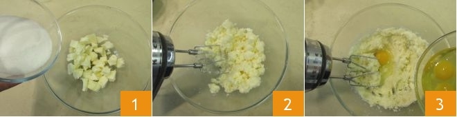 Um den Kuchen zuzubereiten, stellen Sie zuerst sicher, dass alle Zutaten Zimmertemperatur haben, um den Teig besser zu verarbeiten. In einer Schüssel geben Sie die Butter in Stückchen und den Zucker 1, schlagen Sie mit einem elektrischen Mixer für mindestens 5 Minuten 2, bis es hell und schaumig ist. Geben Sie dann die Eier nacheinander hinzu 3 (warten Sie, bis jedes Ei gut eingearbeitet ist, bevor Sie das nächste hinzufügen).