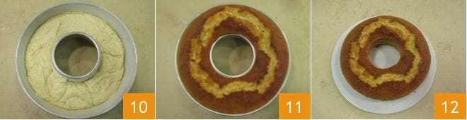 Fetten und mehlen Sie eine Kuchenform mit einem Durchmesser von 23 cm und gießen Sie den Teig hinein 10. Backen Sie den Kuchen im vorgeheizten statischen Ofen bei 180°C für 45 Minuten auf der unteren Schiene (achten Sie immer auf die Eigenschaften Ihres Ofens, um zu prüfen, ob es möglicherweise ein paar Minuten weniger oder mehr Backzeit benötigt). Nach dem Backen wird der Kuchen oben golden aussehen, nehmen Sie ihn heraus 11, lassen Sie ihn abkühlen und stürzen Sie ihn dann auf eine Servierplatte. Ihr Kuchen ist bereit, um genossen zu werden 12.