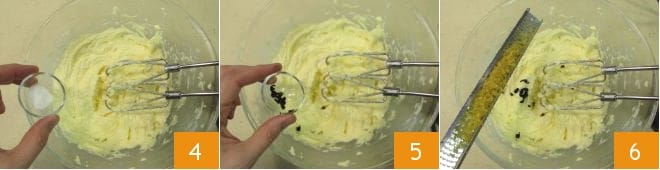 Jetzt aromatisieren Sie die Mischung mit dem Salz 4, den Samen der Vanilleschote 5 und der Zitronenschale 6.