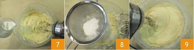 Nun gießen Sie die Milch in einem dünnen Strahl hinzu 7, abwechselnd mit dem gesiebten Mehl und dem Backpulver 8, mischen Sie nach und nach mit dem elektrischen Mixer, bis Sie eine homogene und klumpenfreie Mischung erhalten 9.