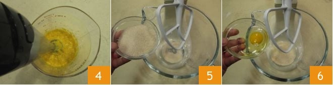 und pürieren Sie alles mit einem Stabmixer zu einer glatten Creme 4. Geben Sie nun den braunen Zucker in die Schüssel einer Küchenmaschine mit Flachrührer 5, fügen Sie das Ei hinzu 6 und arbeiten Sie bei niedriger Geschwindigkeit, bis die Mischung hell und schaumig ist.