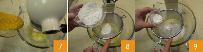 Fügen Sie die Kürbiscreme hinzu 7 und arbeiten Sie weiter, um sie zu vermischen. Sieben Sie nun das Reismehl 8 und das Backpulver 9 in die Schüssel,