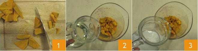 Um die Kürbis-Schoko-Törtchen zuzubereiten, reinigen Sie zuerst den Kürbis und schneiden ihn in Stücke 1: Sie benötigen 160 g gereinigten Kürbis. Geben Sie den Kürbis in einen hohen, schmalen Behälter, fügen Sie das Pflanzenöl 2 und die Mandelmilch 3 hinzu