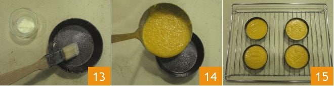 Fetten Sie 13 und mehlen Sie 4 runde Förmchen mit einem Durchmesser von 10 cm und einer Höhe von 3 cm ein, füllen Sie sie bis zu drei Vierteln mit der Mischung 14 und stellen Sie sie auf den Rost des vorgeheizten Ofens bei 170° im statischen Modus 15. Backen Sie die Törtchen etwa 20 Minuten lang.