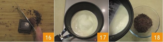 In der Zwischenzeit kümmern Sie sich um die Ganache: Hacken Sie die Zartbitterschokolade fein mit einem Messer 16, dann geben Sie die Sahne in einen kleinen Topf und erhitzen sie bis knapp unter den Siedepunkt 17. Geben Sie die gehackte Schokolade in eine Schüssel, gießen Sie die heiße Sahne über die Schokolade 18