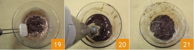 und rühren Sie kräftig mit einem Spatel, bis eine Creme entsteht 19. Pürieren Sie die erhaltene Creme mit einem Stabmixer, um sie glatter und glänzender zu machen 20, decken Sie sie dann mit Frischhaltefolie ab 21 und lassen Sie sie mindestens 30 Minuten im Kühlschrank abkühlen.