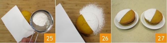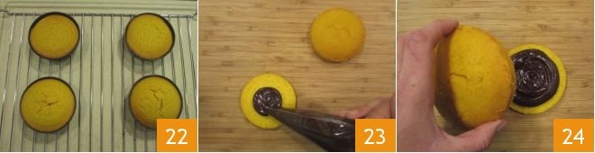 Wenn die Törtchen gebacken sind, aus dem Ofen nehmen 22 und abkühlen lassen, dann aus den Förmchen entfernen und quer halbieren. Geben Sie die Schokoladen-Ganache in einen Spritzbeutel und füllen Sie die untere Hälfte der Törtchen 23, dann decken Sie sie mit der oberen Hälfte ab 24.