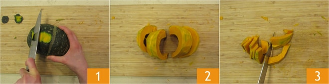 Um die Kürbisgnocchi ohne Teig vorzubereiten, halbieren Sie zuerst den Kürbis, entfernen die inneren Samen und schälen ihn 1. Schneiden Sie den Kürbis zuerst in Spalten 2 und dann in dünne Scheiben 3.