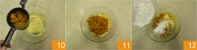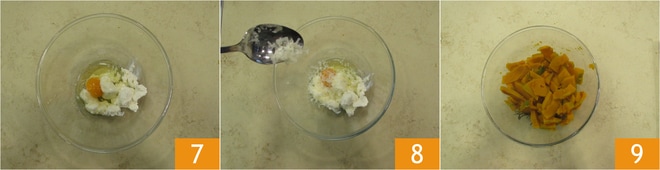 Fügen Sie auch das Ei 7, den geriebenen Käse 8 hinzu und mischen Sie. Holen Sie den gekochten Kürbis 9.