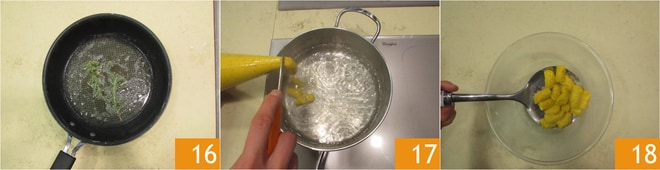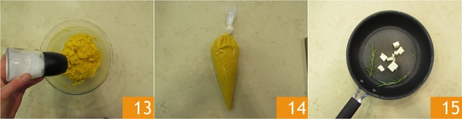 Salzen und mischen Sie, um alles zu verbinden 13. Geben Sie die Mischung in einen Spritzbeutel ohne Tülle 14. Bereiten Sie das Gewürz vor: Geben Sie die Butter und den Rosmarin in eine kleine Pfanne 15.