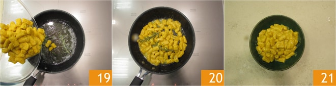 Geben Sie sie in die Pfanne mit dem Gewürz 19, schwenken Sie sie kurz, um sie zu würzen 20, und servieren Sie die Kürbisgnocchi ohne Teig sofort 21.