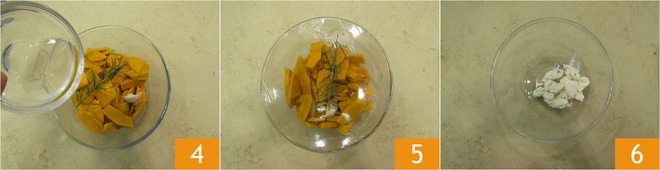 Geben Sie den Kürbis in eine Schüssel, bedecken Sie ihn mit einer halben Tasse Wasser 4, würzen Sie mit Knoblauch und Rosmarin und wickeln Sie die Schüssel in Frischhaltefolie 5. Kochen Sie ihn etwa 5-8 Minuten auf höchster Stufe in der Mikrowelle, bis das Fruchtfleisch weich ist. In der Zwischenzeit geben Sie den Ricotta in eine Schüssel 6.