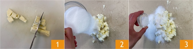 Um die Küsse von Frau zuzubereiten, beginnen Sie mit dem Teig: Schneiden Sie die Butter bei Raumtemperatur in Stücke 1. Fügen Sie den Zucker 2 und das Maldon-Salz hinzu 3.