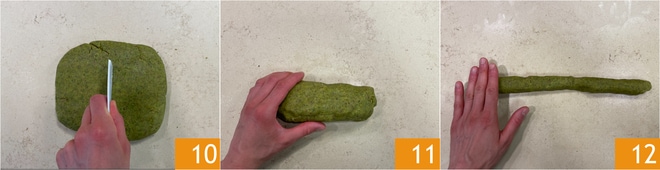 Holen Sie den Teig heraus und teilen Sie ihn in zwei Hälften 10, rollen Sie eine Hälfte zu einem Stab 11 12.