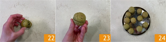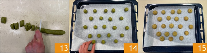 Schneiden Sie etwa 2 cm große Stücke ab 13, formen Sie Kugeln und legen Sie sie auf ein mit Backpapier ausgelegtes Blech 14. Backen Sie sie im vorgeheizten Ofen bei 165° C für 20 Minuten. Sobald sie gebacken sind, nehmen Sie sie heraus und lassen Sie sie abkühlen 15.
