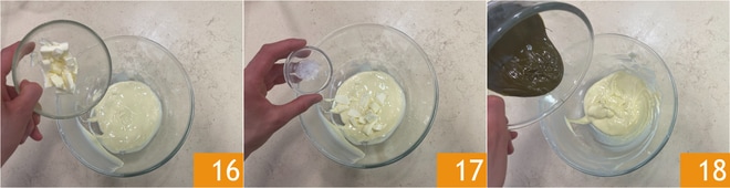 Zubereitung der Pistaziencreme: In einer Schüssel den warmen geschmolzenen Schokolade, die Butter 16, das Maldon-Salz 17 mischen, um die Butter aufzulösen, dann die Pistaziencreme hinzufügen 18.