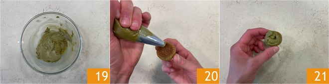 Rühren Sie weiter, um eine homogene Creme zu erhalten 19, und füllen Sie sie in einen Spritzbeutel. Nehmen Sie einen Keks, drücken Sie die Creme darauf 2021.