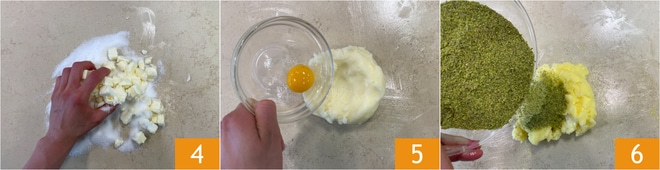 Kneten Sie alles, um einen Teig zu formen 4. Fügen Sie das Eigelb hinzu 5 und geben Sie auch das Pistazienmehl dazu 6.