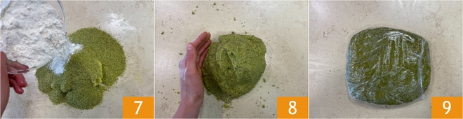 Geben Sie schließlich das 00-Mehl dazu 7, kneten Sie, um einen homogenen Teig zu formen 8, wickeln Sie ihn in Frischhaltefolie 9 und lassen Sie ihn 2 Stunden im Kühlschrank ruhen.